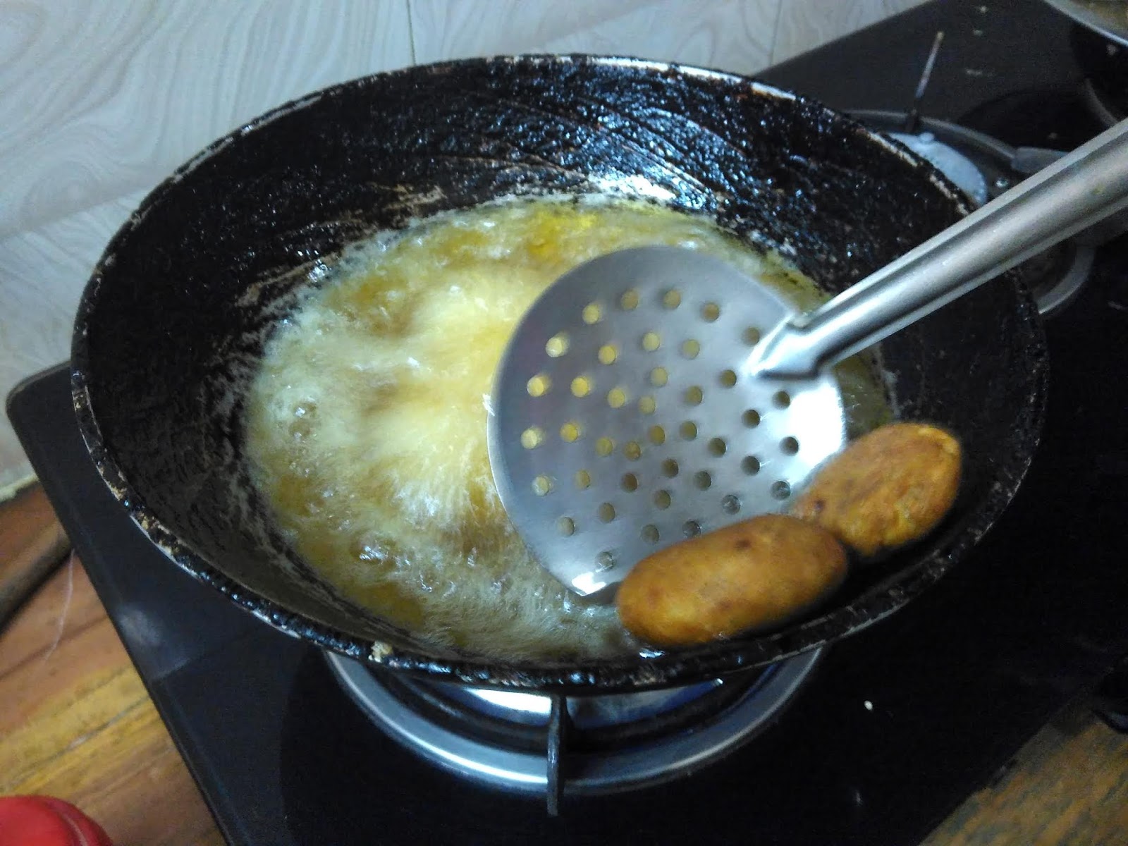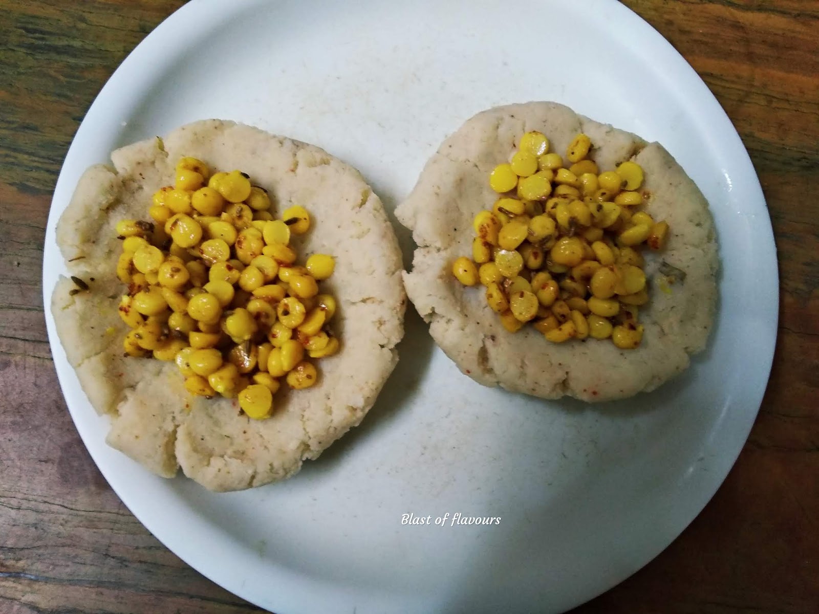 Flatten potato balls on hand and fill 1 tsp chana dal into each flattened dough