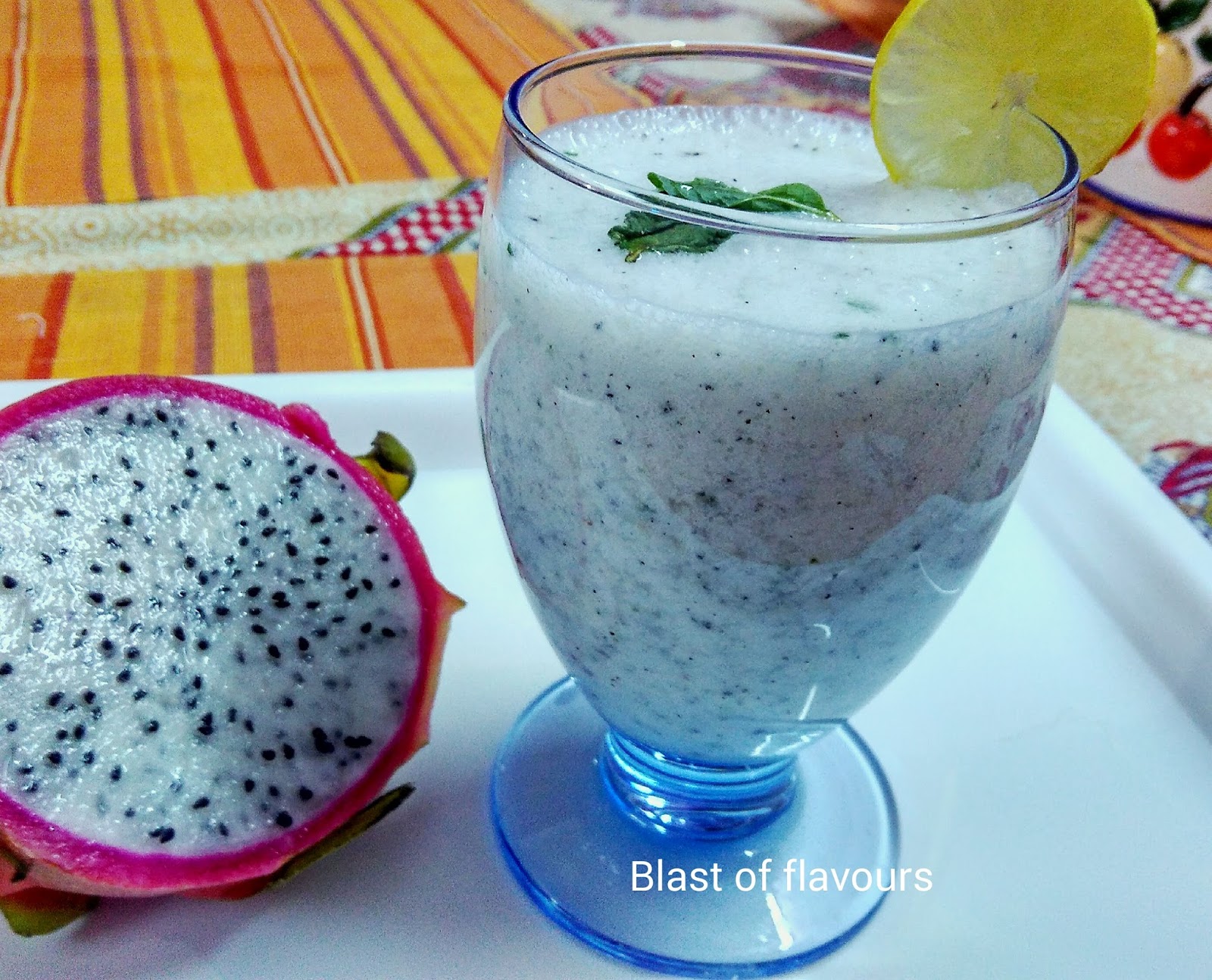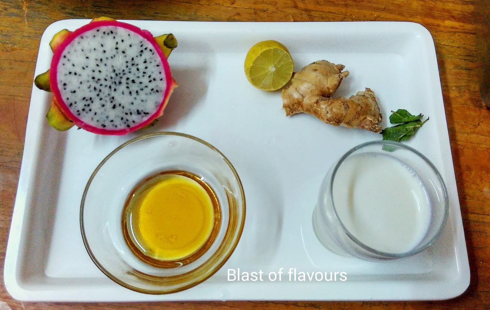 Scaly and vibrant outside but fleshly, seedy, and dense inside…….This wonderful Tropical fruit is a storehouse of nutrients. like vitamin B and C….Low in calories and zero cholesterol, it has the potential to become a favourite of weight loss seekers. This is sweet and fresh when eaten as a fruit, but other dishes which are prepared with this, like the milkshake, smoothies, ice cream or cake taste awesome…Here I’m sharing a smoothie that I have prepared with coconut milk and honey…Ginger and mint have enhanced and taken the flavour to another level