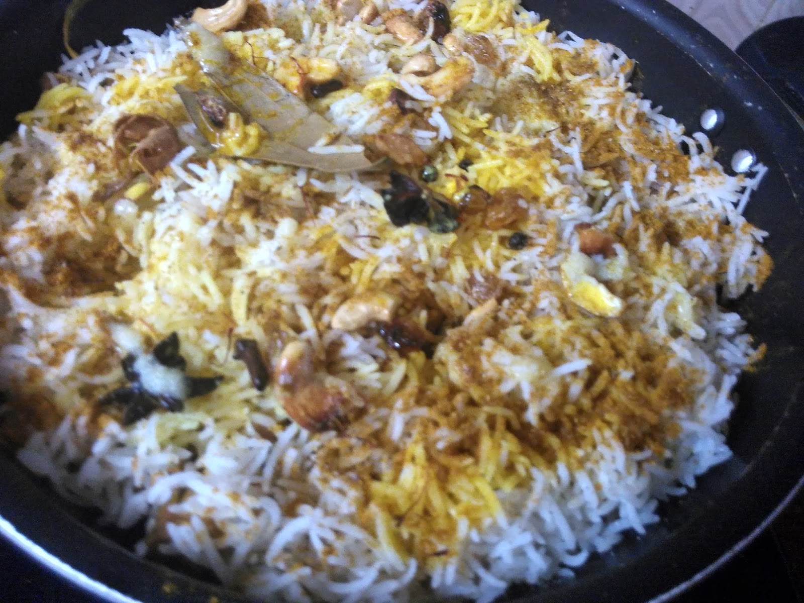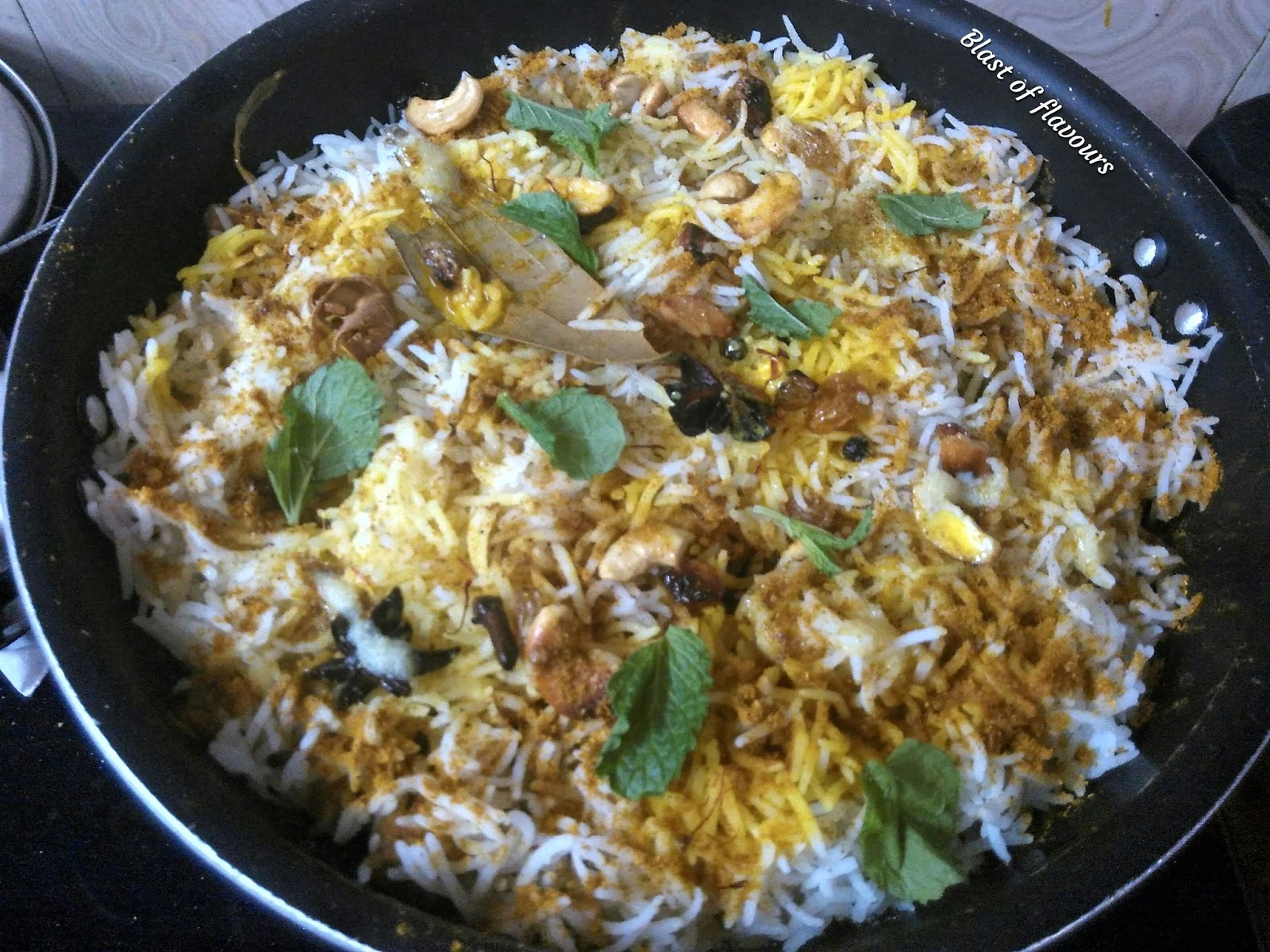 Then the 5th layer of rice and next layer of remaining powdered spices, mix nuts mint leaves and whole spices