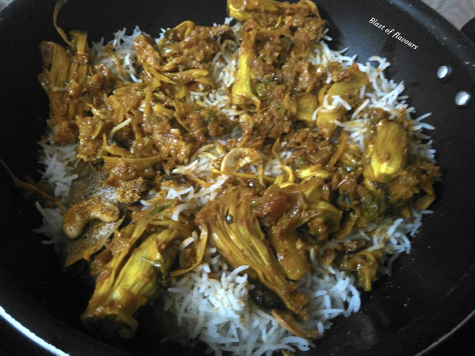 I use cooked kathal to make this dish.In fact, when I cook jackfruit-or-kathal-masala or kathal sabji at home, I make it little more extra to cook the biryani out of it. Next day the flavours mature to make this biryani tastier