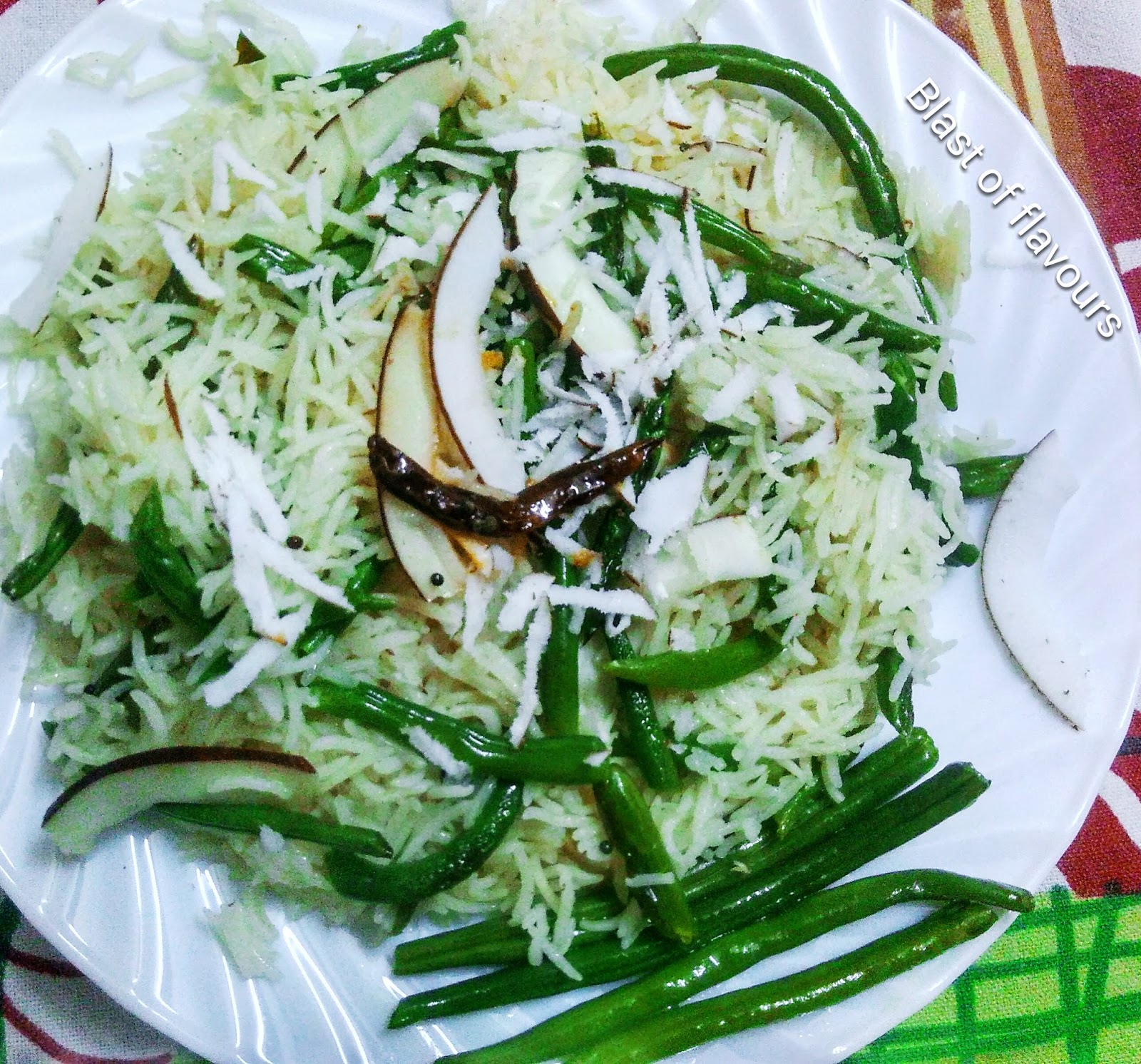 Stir fried green beans rice is the perfect combination of rice with green beans that is cooked together by adding some regular Indian spices and coconut shavings. This rice dish is a simple, homely recipe ready in minutes. As my family loves South Indian flavors, I have added mustard seeds and shredded coconut in the tadka/tempering. Kids who do not like green veggies would certainly relish this. This is a wholesome one pot meal which can be packed in their tiffin